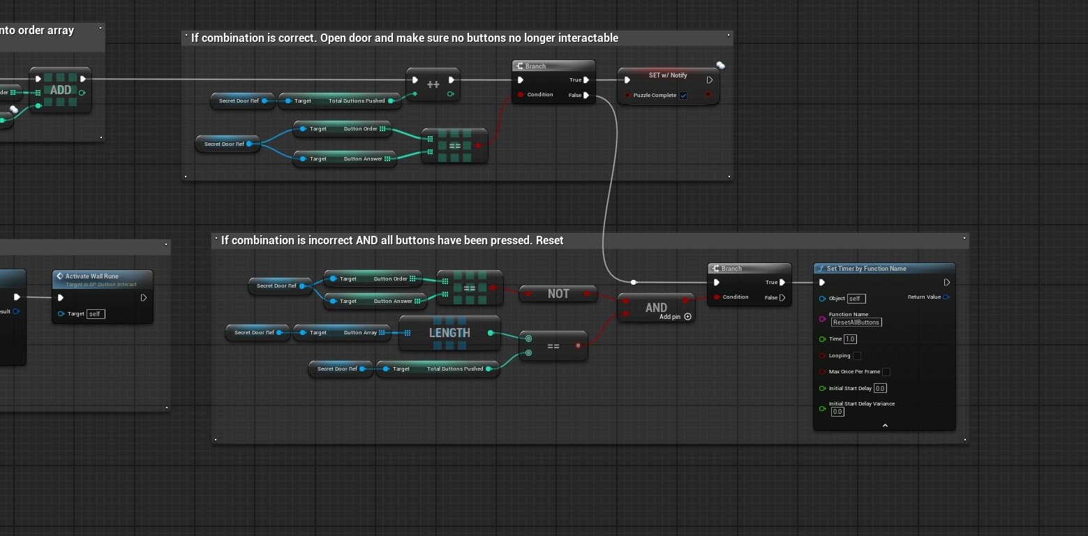 This is a button puzzle combination I created that has multiplayer functionality. The buttons will always be different so the it changes every time the player sees it. It also communicated with the “clues” on the wall so you would know which order to press it in. I had numbers showing for simple debugging to make sure the randomness worked correctly. All the code is my own and gives a breakdown of how I created this. The last screenshot is the code for the door that opens once the combination is correct.
